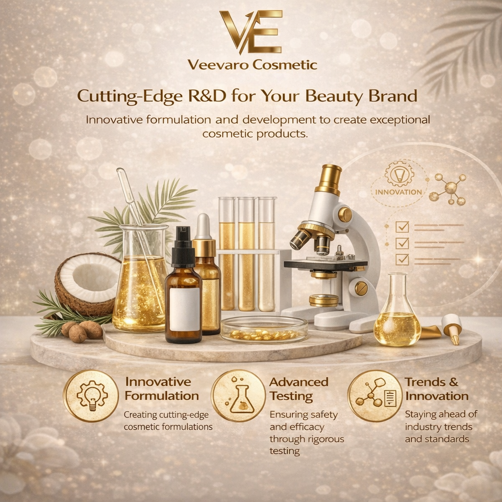 Our Research and Development team at Veevaro Cosmetic is dedicated to driving innovation and excellence in every product we create. With a deep understanding of market trends, advanced scientific expertise, and access to high-quality ingredients, we develop cutting-edge formulations that meet evolving consumer needs. From concept development to final product testing, our R&D process ensures safety, effectiveness, and consistency at every stage. We focus on creating unique, customized solutions that help brands stand out in a competitive market, while maintaining the highest standards of quality, compliance, and performance.